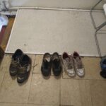 Shoes left outside a shower centre for people on the move, Belgrade, Serbia..