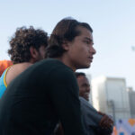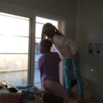 Children looking out from a container window in the CCAC, Samos, Greece.